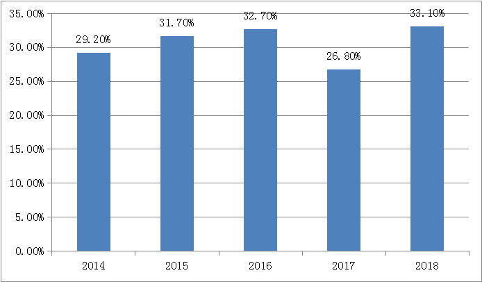 2018中國(guó)工業(yè)機(jī)器人領(lǐng)域占比(%)