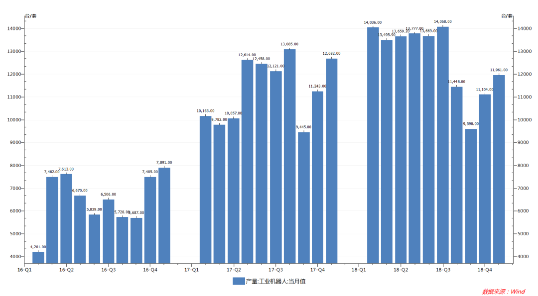 2018年1-12月,我國(guó)工業(yè)機(jī)器人產(chǎn)量達(dá)14.7萬臺(tái),同比增長(zhǎng)12.2%;其中12月份產(chǎn)量達(dá)11961臺(tái)。受國(guó)內(nèi)宏觀經(jīng)濟(jì)下行,下游汽車、3C、新能源等行業(yè)投資放緩和中美貿(mào)易戰(zhàn)的影響,國(guó)內(nèi)工業(yè)機(jī)器人行業(yè)發(fā)展壓力逐步顯現(xiàn),6月、7月、8月增幅相比前幾個(gè)月35%的增速大幅下降。但工業(yè)機(jī)器人行業(yè)短期的增速放緩并不能改變機(jī)器代人的大趨勢(shì)。我國(guó)自動(dòng)化改造空間巨大,制造業(yè)轉(zhuǎn)型升級(jí)迫切;人口紅利逐步消失,老齡化問題嚴(yán)重,勞動(dòng)力出現(xiàn)短缺;疊加國(guó)家政策的大力支持,我國(guó)工業(yè)機(jī)器人行業(yè)未來發(fā)展空間仍然巨大。