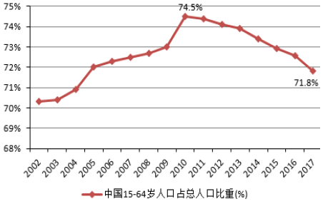 近年來,中國(guó)人口結(jié)構(gòu)發(fā)生了巨大變化,15-64歲勞動(dòng)適齡人口占總?cè)丝诘谋戎刈?011年以來呈現(xiàn)逐步下滑的趨勢(shì),2017年該比重已經(jīng)下滑至71.8%,相比2010年的最高點(diǎn)降低了2.7個(gè)百分點(diǎn)。另外,中國(guó)社會(huì)的老齡化問題更加嚴(yán)重,中國(guó)人口紅利逐步消失,目前已經(jīng)出現(xiàn)了劉易斯拐點(diǎn)。人口結(jié)構(gòu)的變化,勞動(dòng)力供給條件的變化顯著的推高了我國(guó)的勞動(dòng)成本,不僅削弱了制造業(yè)的競(jìng)爭(zhēng)力,對(duì)勞動(dòng)密集型的產(chǎn)業(yè)同樣也帶來了嚴(yán)峻的挑戰(zhàn),也削弱了中國(guó)產(chǎn)品在全球市場(chǎng)的競(jìng)爭(zhēng)力。