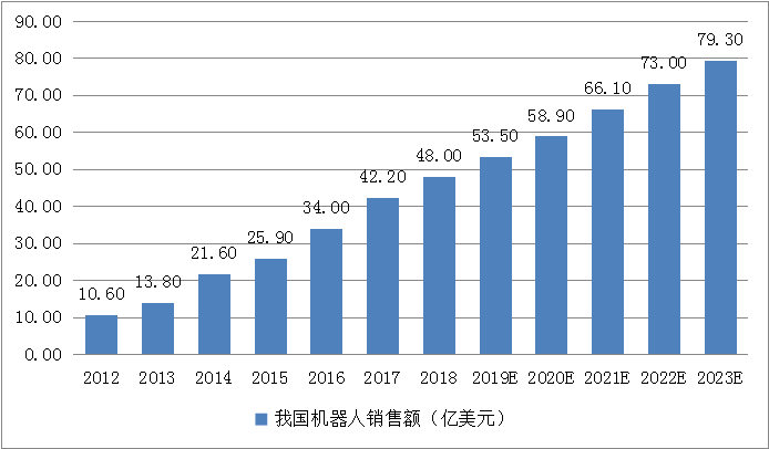 2018年,我國(guó)工業(yè)機(jī)器人銷售額達(dá)48億美元,同比增長(zhǎng)24.1%。未來隨著生產(chǎn)方式向柔性、智能、精細(xì)轉(zhuǎn)變,對(duì)工業(yè)機(jī)器人的需求將呈現(xiàn)大幅增長(zhǎng)。根據(jù)前瞻產(chǎn)業(yè)研究院的預(yù)測(cè),到2023年,國(guó)內(nèi)市場(chǎng)規(guī)模將翻一番,進(jìn)一步擴(kuò)大到79.3億美元。