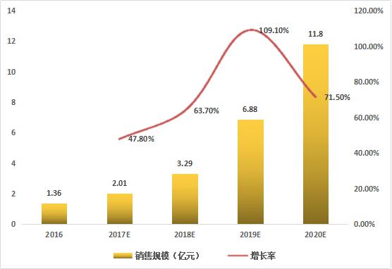 根據艾媒咨詢數據顯示,2016年中國智能音箱銷售規(guī)模為1.36億元,預計2017年將突破兩億,達到2.01億,增長率為47.8%;預計到2020年,智能音箱銷售規(guī)模將超過10億元。目前雖眾多廠商已推出智能音箱產品,但市場總體銷售規(guī)模仍處于較低水平,隨著產品進一步優(yōu)化升級及智能家居的推廣,中國智能音箱消費市場潛力將得到釋放,行業(yè)有望迎來爆發(fā)式增長。