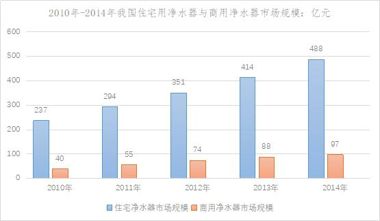 中國凈水器應(yīng)用市場主要是居民及商業(yè)凈水器市場。2014年國內(nèi)商用凈水器市場達到97億元,居民住宅凈水器市場規(guī)模達到488億元,同時住宅凈水器市場占比明顯大于商用凈水器市場。