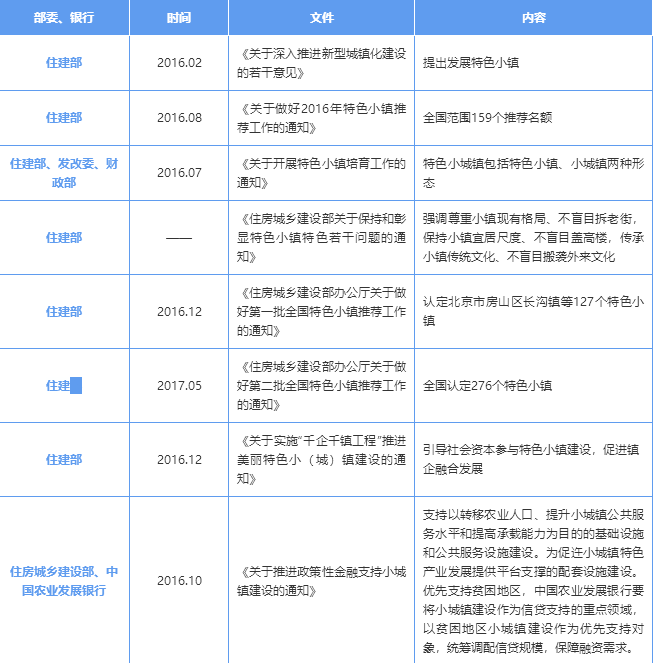2016年以來(lái),國(guó)家發(fā)改委、住建部聯(lián)合多個(gè)銀行出臺(tái)多項(xiàng)支持特色小鎮(zhèn)建設(shè)的政策文件及金融支持文件。