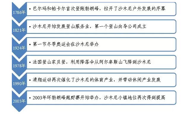 沙木尼的作為特色小鎮(zhèn)的最初起源,來(lái)自1786年8月當(dāng)?shù)孬C人巴爾瑪和醫(yī)生帕卡爾兩人首次登上勃朗峰;1821年開始,沙木尼開始發(fā)展登山服務(wù)業(yè),小鎮(zhèn)內(nèi)34名的本地向?qū)ЫM成了一個(gè)向?qū)Ч荆?924年第一屆冬季奧運(yùn)會(huì)在沙木尼舉辦,世界性的滑雪教練訓(xùn)練中心也在這里落戶。至此,沙木尼的特色小鎮(zhèn)地位已經(jīng)基本