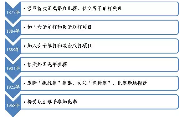 溫網(wǎng)于1877年首次于全英草地網(wǎng)球和門球俱樂部管理之下在溫布爾登Worpl路附近的一塊場(chǎng)地舉行,當(dāng)時(shí)僅有男子單打比賽。1884年,全英俱樂部增加了女子單打和男子雙打比賽,女子雙打和混合雙打則在1889年加入。1922年比賽搬遷到到了如今的Church路場(chǎng)地。如同其他3項(xiàng)“大滿貫”賽事,溫布爾登在1968年網(wǎng)球公開時(shí)代到來(lái)之前,只對(duì)頂級(jí)的業(yè)余選手開放。而之后,溫網(wǎng)是所有職業(yè)選手的圣地。