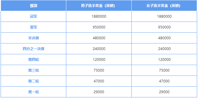 溫網(wǎng)不斷攀升的獎(jiǎng)金也是吸引選手參賽的一大因素。1984年,溫網(wǎng)男子單打冠軍獎(jiǎng)金為10萬(wàn)英鎊,女子單打冠軍為9萬(wàn)英鎊;1985年男單冠軍為13萬(wàn)英鎊;1987年男單冠軍獎(jiǎng)金為15.5萬(wàn)英鎊;1991年男單冠軍獲24萬(wàn)英鎊,女單冠軍獲21.6萬(wàn)英鎊,甚至第1輪遭淘汰選手也可獲得一筆獎(jiǎng)金,男子3600英鎊,女子2790英鎊。如今,溫網(wǎng)已經(jīng)實(shí)現(xiàn)了男女運(yùn)動(dòng)員獎(jiǎng)金持平政策,每年共有2700萬(wàn)磅獎(jiǎng)金,已經(jīng)超過美網(wǎng)(2600萬(wàn)磅)、澳網(wǎng)(2300萬(wàn)磅)、法網(wǎng)(2200萬(wàn)磅)成為獎(jiǎng)金最多的公開賽。